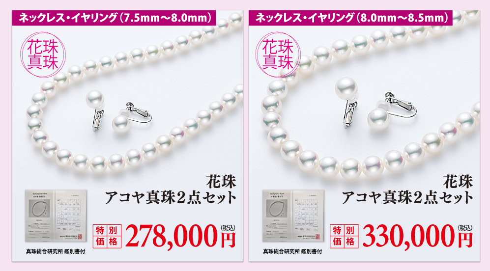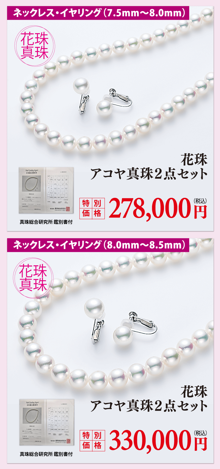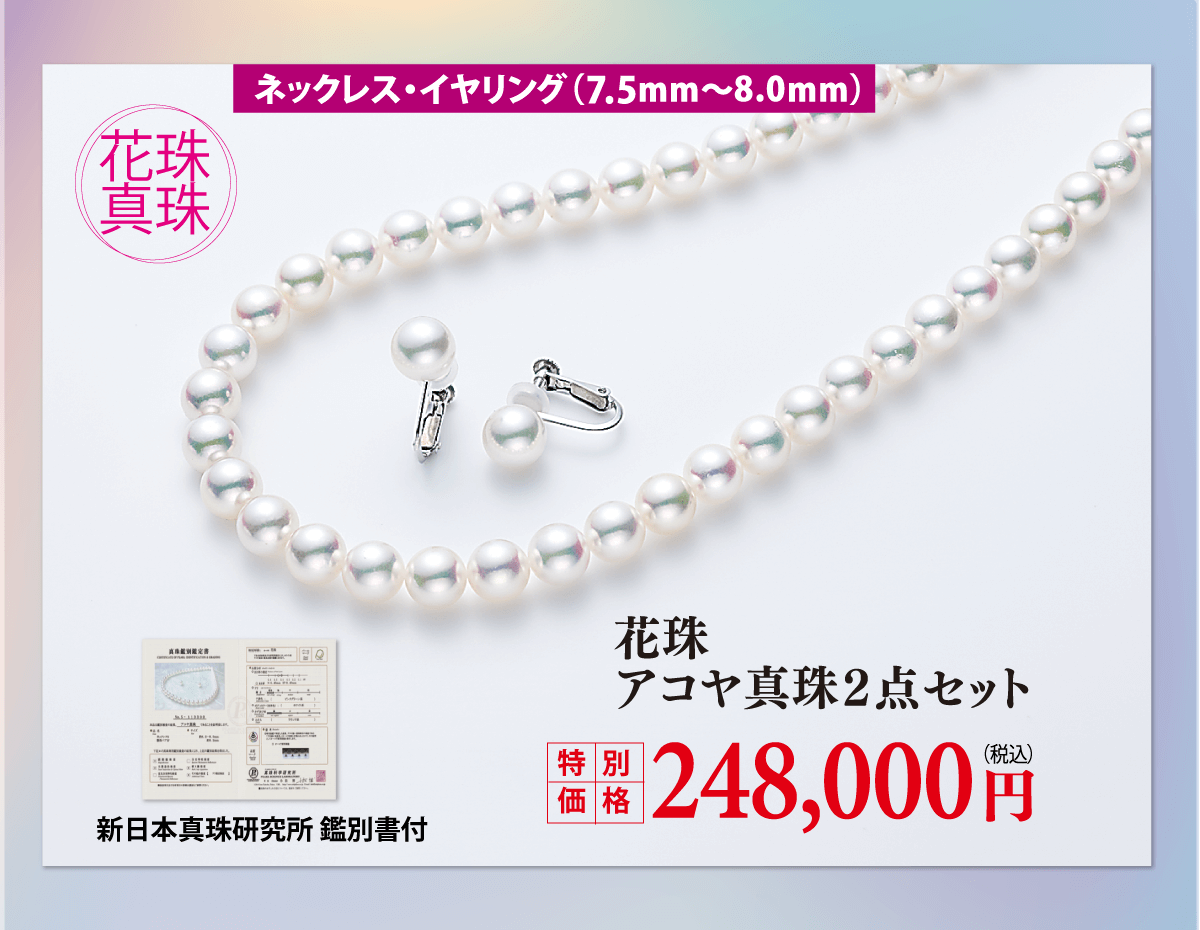 通常のアコヤ真珠はもちろん、花珠真珠の最高級「オーロラ花珠」から